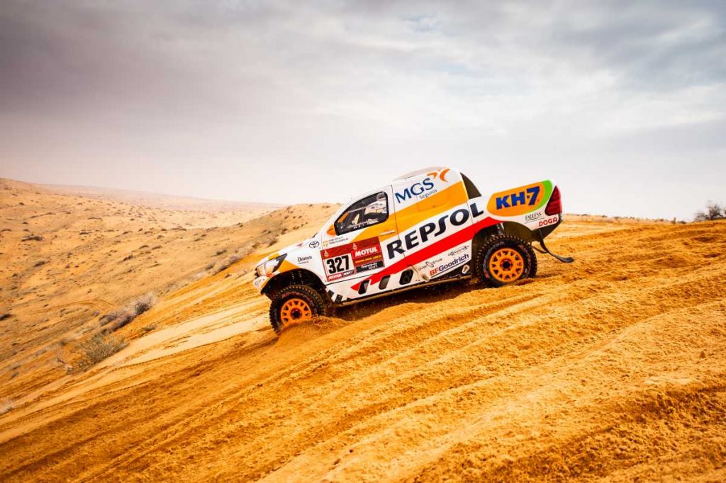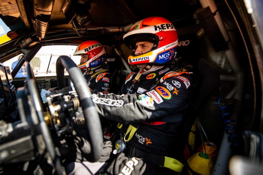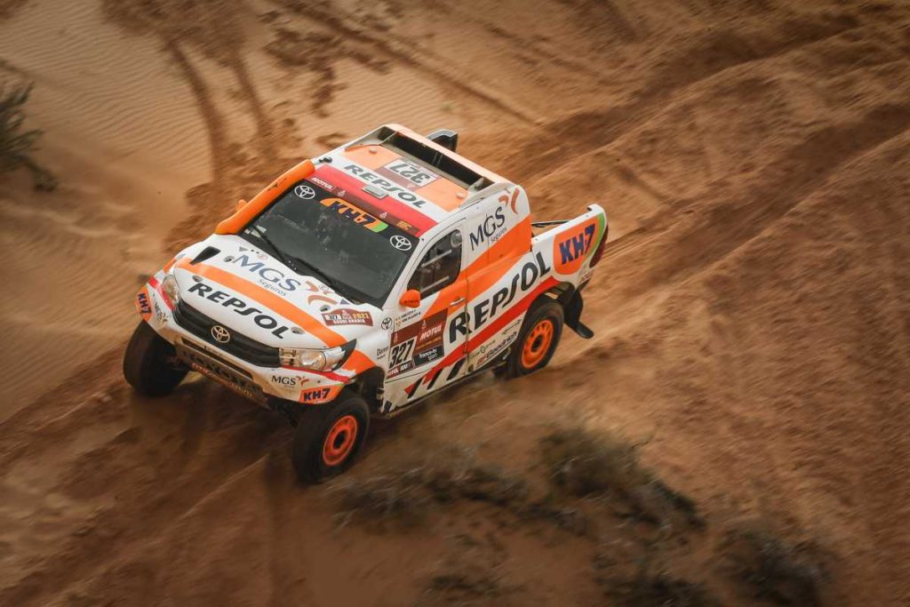 La jornada, con salida en Ha’il y llegada a Sakaka, constaba de 267 kilómetros de enlace y 471 cronometrados, con un recorrido muy variado sobre arena, dunas, ríos secos y piedra, mucha piedra. El coche de Isidre Esteve y Txema Villalobos ha sufrido su primer pinchazo del presente Dakar antes de completar una cuarta parte de la etapa. Ese inesperado contratiempo ha obligado a la pareja de Repsol, MGS Seguros, KH-7 y Toyota España a extremar las precauciones, al disponer de sólo tres ruedas de recambio para hoy y mañana.
