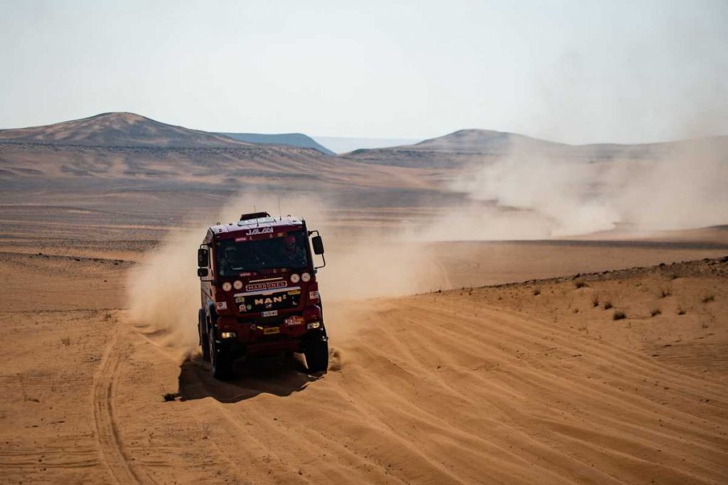 En un terreno rápido y pedregoso, con 375 km de especial y 334 de enlace desde Sakaka a Neom, el Marrones Jalan ha vuelto a hacer gala de su regularidad para franquear el octavo desafío que les ha propuesto la carrera saudí. Pese a que su camión está tocado, va en cinco de los seis cilindros de su propulsor, Jacoste y sus compañeros han conseguido completar el recorrido marcado con buenas sensaciones.