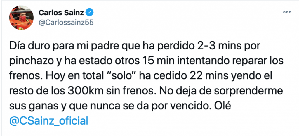 @Carlossainz55: Día duro para mi padre que ha perdido 2-3 mins por pinchazo y ha estado otros 15 min intentando reparar los frenos. Hoy en total “solo” ha cedido 22 mins yendo el resto de los 300km sin frenos. No deja de sorprenderme sus ganas y que nunca se da por vencido. Olé @CSainz_oficial