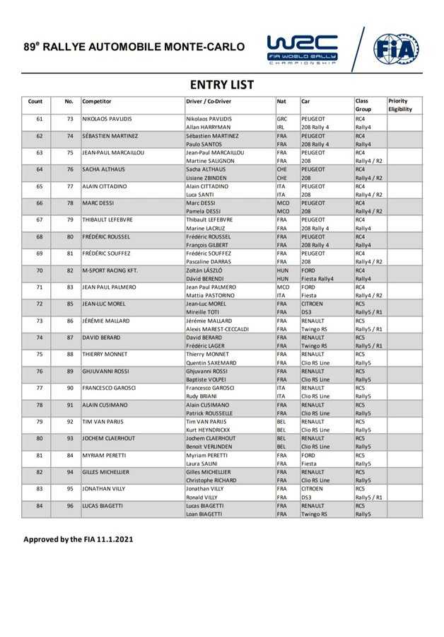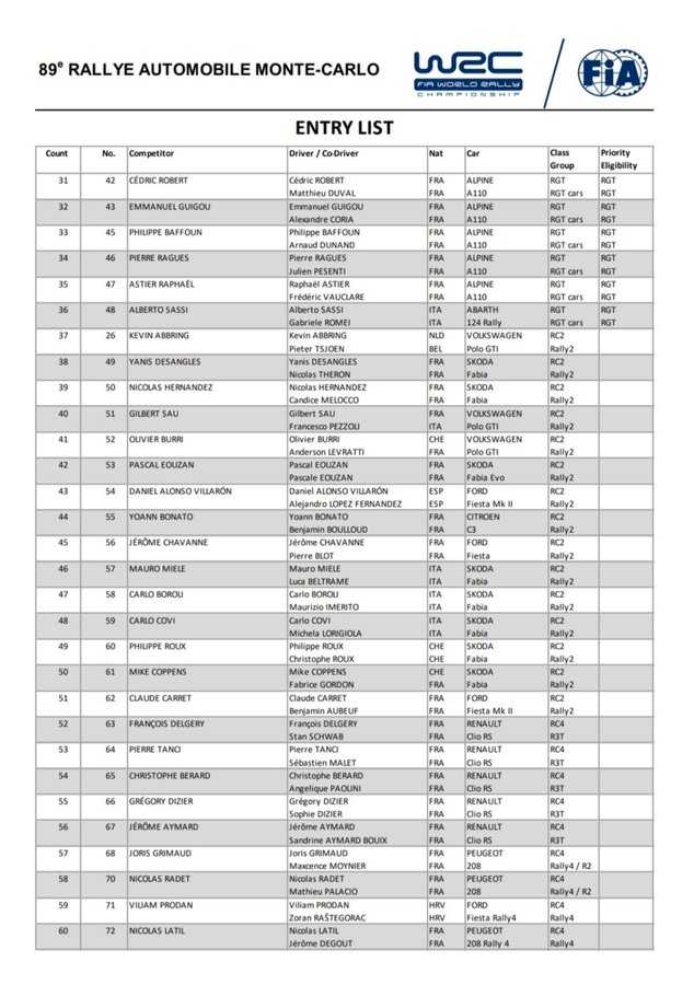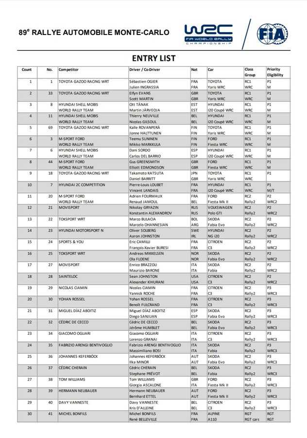 El organizador del Automóvil Club de Mónaco publicó la lista este pasado lunes, donde estará el actual campeón de constructores Hyundai Motorsport ha inscrito a Ott Tänak, Thierry Neuville y Dani Sordo en el i20s. El español Sordo estará acompañado por Carlos Del Barrio por última vez antes de que su compatriota Borja Rozada asuma el papel de copiloto.