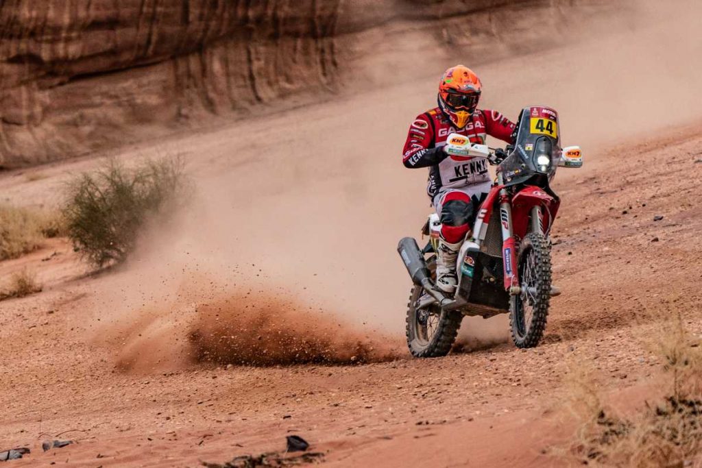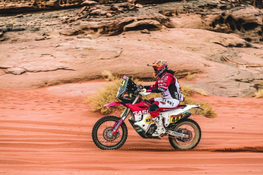 “Había empezado bien la etapa, pero se ha complicado. Ha habido un punto en el que con [Sebastian] Bühler y [David] Knight nos hemos perdido un poco y entonces ha llegado un grupo de pilotos que iba mucho más lento y que también andaban perdidos. Al vernos, han encontrado la pista buena justo cuando tomábamos el camino correcto. En mi caso, me ha tocado tragarme el polvo de esas motos y quads durante casi 200 kilómetros”, narra la de KH-7 y GasGas.