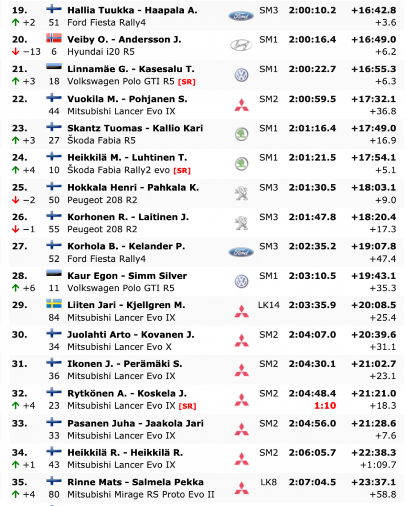Cuarto fue Juha Salo con otro Skoda Fabia Rally2 evo, seguido del piloto de Fórmula 1 en el equipo Mercedes Valteri Bottas, que a los mandos del Citroën DS3 WRC del equipo PH Sport remontó de la octavo plaza hasta la sexta.