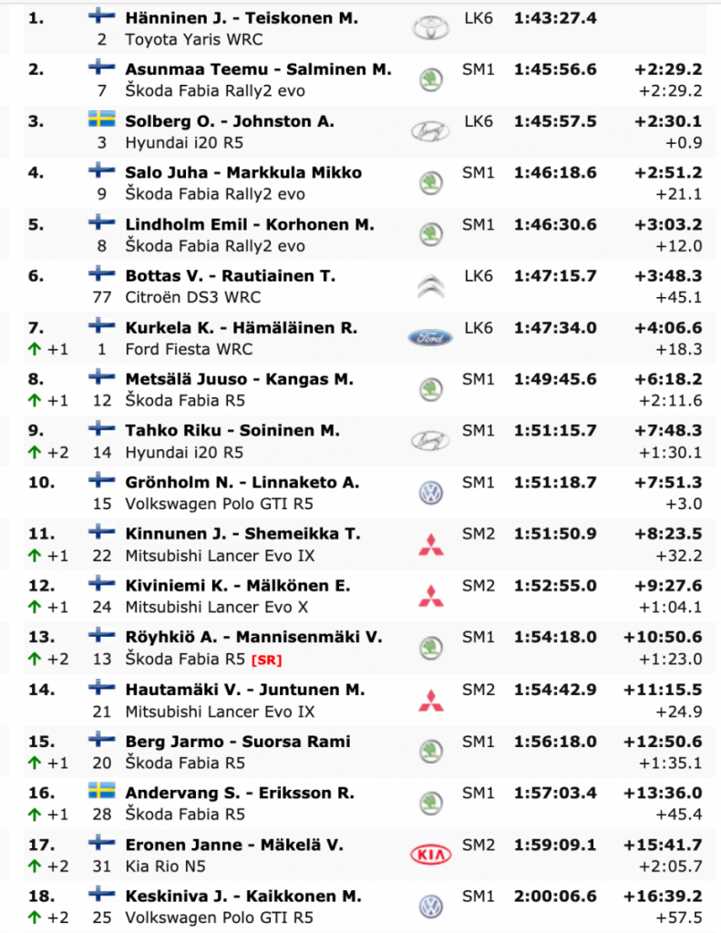 Hänninen invirtió un tiempo total de 1:43:27.4 en recorrer los siete tramos celebrados, tres el viernes y cuatro el sábado, para lograr una ventaja de 2:29.2 respecto a su compatriota Teemu Asunmaa, que llevó el Skoda Fabia Rally2 evo al segundo lugar por la escasa renta de 0.9 respecto a Oliver Solberg, tercero, que en la segunda jornada del rally le redujo 29 segundos desde la sexta hasta tercera plaza.
