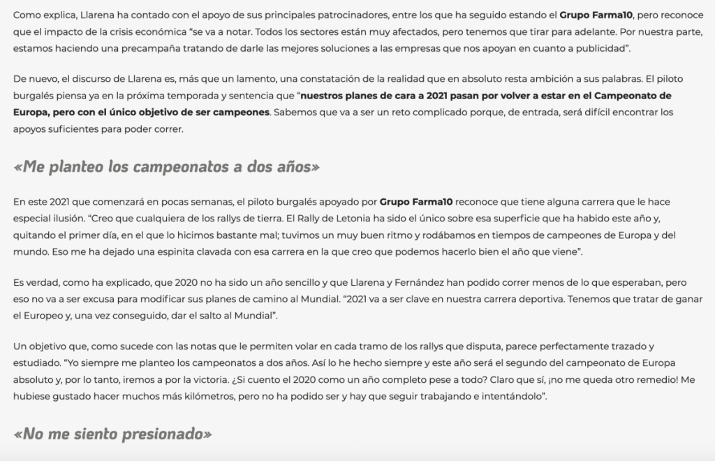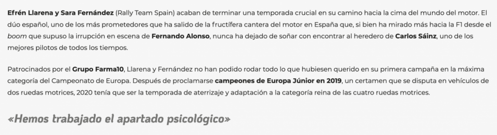 Efrén Llenera: «La próxima temporada el objetivo es conseguir el título de Campeones de Europa» Por Rafa León En 19/01/2021 23:26 Compartir FacebookTwitterWhatsAppEmailTelegramLinkedin Campeonato de EuropaCampeonato de Europa de RallysEfrén LleneraERCEspañaSara Fernández Compartir