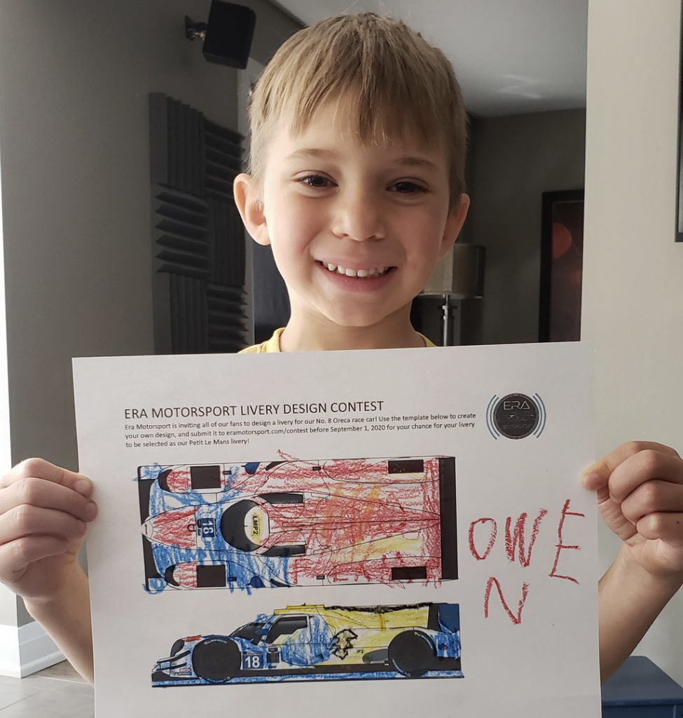 Una vez notificado que su diseño aterrizaría en un coche de carreras profesional para la carrera más grande del año, Owen envió la siguiente nota de agradecimiento: «Hola Kyle Tilley y Era Motorsports. Gracias por este concurso. Mi nombre es Owen y tengo 6 años. Mis cosas favoritas son las carreras y el hockey. Estoy aprendiendo a conducir en un simulador de carreras. Elegí este diseño porque me gustan los colores y los rayos, ya que las llamas son geniales. Esto fue divertido porque a mi abuelo, a mi papá y a mí nos gusta correr y estábamos en casa durante el COVID».