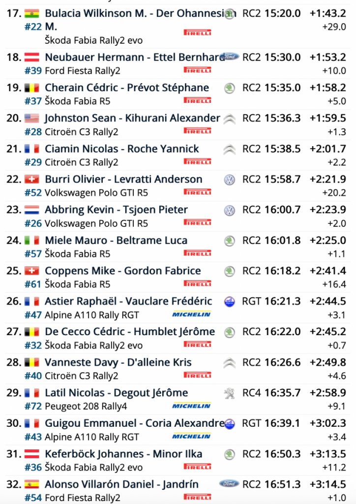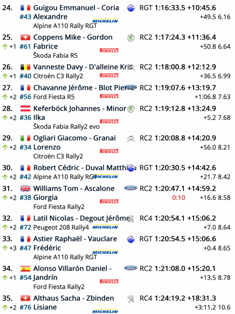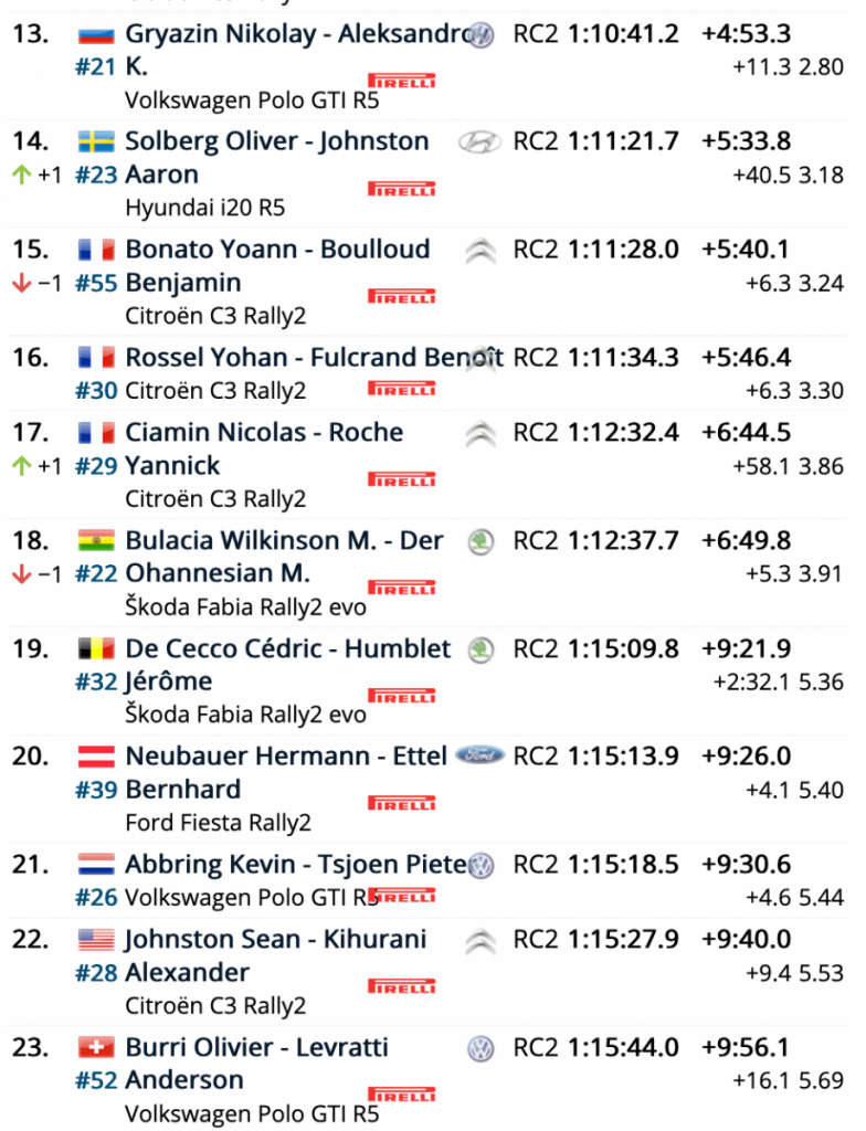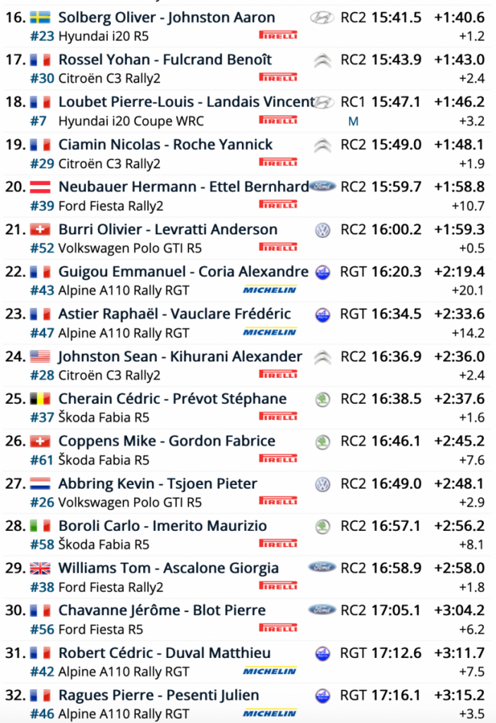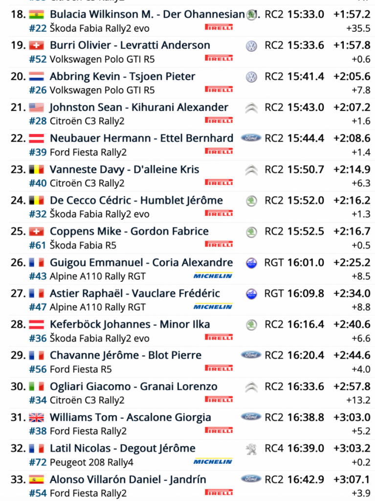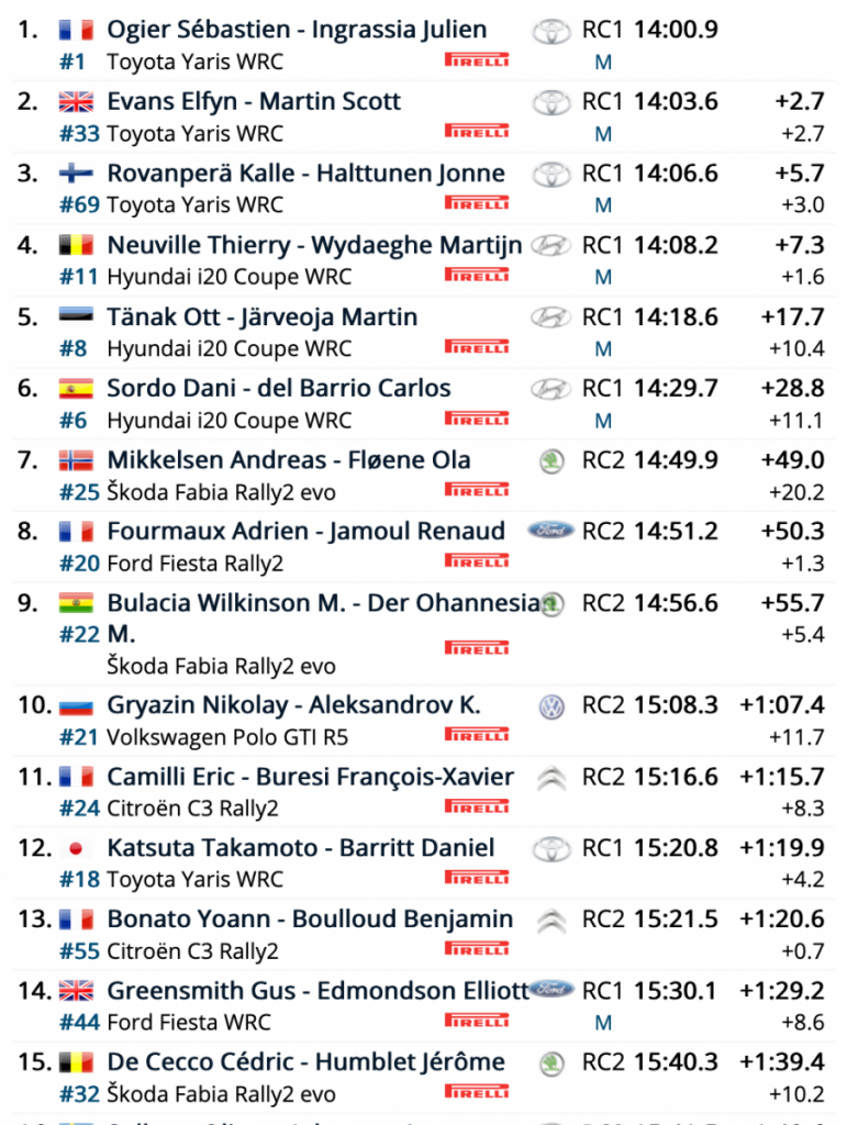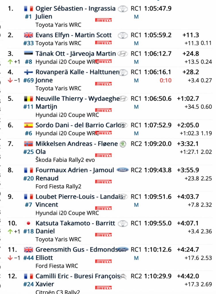 Sus compañeros de equipo, los fineses Kalle Rovanperä y Jonne Halttunen (Toyota Yaris WRC), se pusieron líderes en la primera crono de la jornada, pero que no pudieron contener el mayor empuje de los franceses, cediendo el primer puesto en la segunda especial y bajando hasta el cuarto lugar de la general.