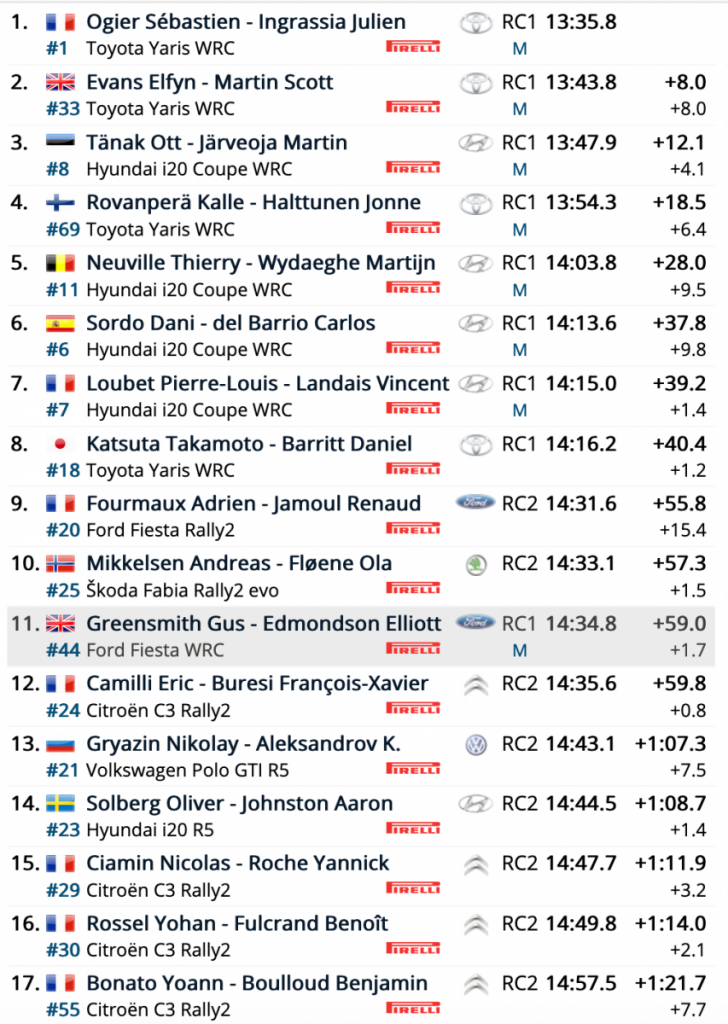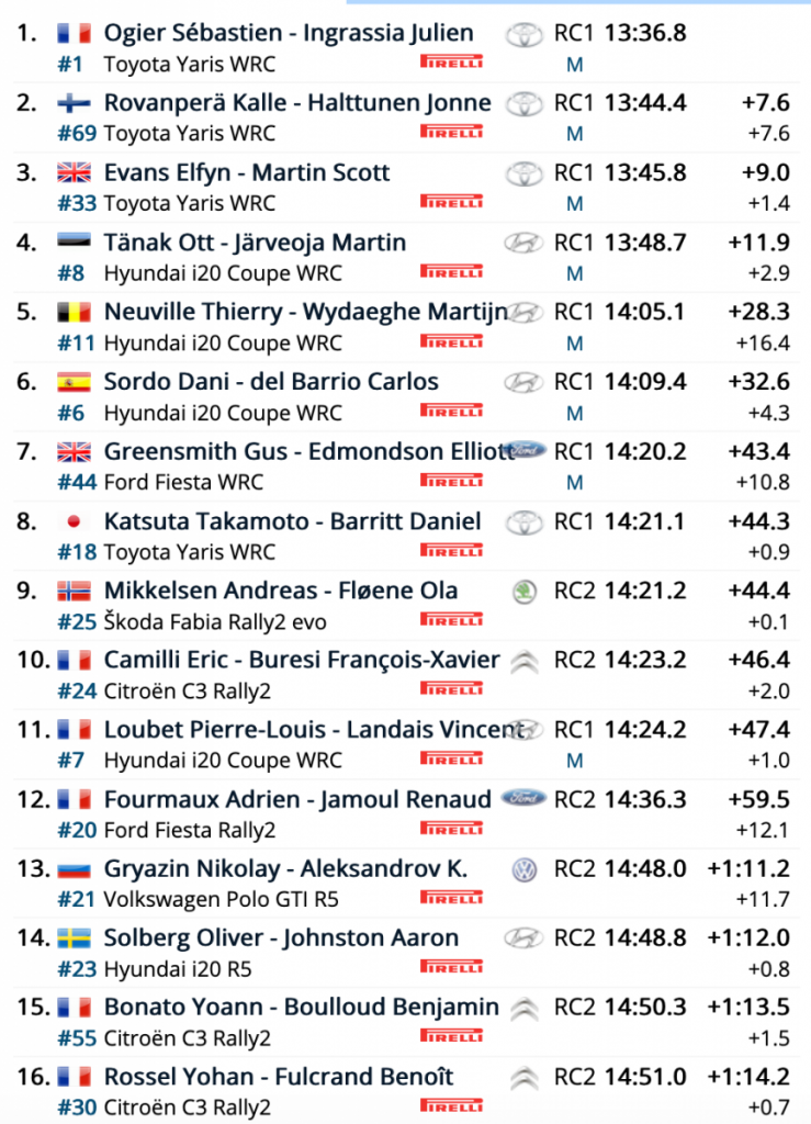 Totalmente fuera de la lucha por la victoria y plazas de podio se encuentran los ganadores de la edición del año pasado, el Thierry Neuville y su nuevo copiloto, Martijn Wydaeghe, que en el Hyundai i20 Coupé WRC se encuentran quintos, a 1:02.7 de la cabeza, a 34.5 de los anteriores y superando en 1:02.3 a sus compañeros, los españoles Dani Sordo y Carlos del Barrio (Hyundai i20 Coupé WRC), sextos.