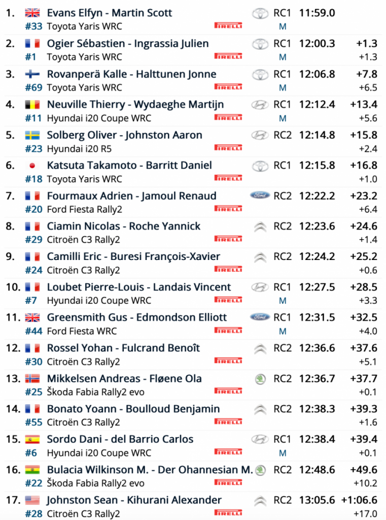 Séptimos y primeros entre los Rally2 están los noruegos Andreas Mikkelsen y Ola Fløene (Škoda Fabia Rally2 evo), con una amplia renta en la segunda categoría del WRC con 2:13.8 sobre el galo del M-Sport Adrien Fourmaux y Renaud Jamoul (Ford Fiesta Rally2), segundos entre los Rally 2 y novenos de la general, siendo octavos sus compañeros de equipo en M-Sport WRT Gus Greensmith y Elliott Edmondson (Ford Fiesta WRC). Los galos Eric Camilli y François-Xavier Buresi (Citroën C3 Rally2) son décimos de la general y terceros entre los Rally2, perdiendo dos segundos en la especial final con su compatriota Fourmaux, que es segundo a 17.6. Undécimos y cuartos de Rally2 se sitúan Oliver Solberg y Aaron Johnston (Hyundai i20 R5), que en la última crono del día marcaron el quinto mejor tiempo total y el mejor entre los Rally2. Salvo error de los tres primeros, tiene complicado poder optar a un puesto de podio en Rally2, puesto que está a 53.2 de Camilli.