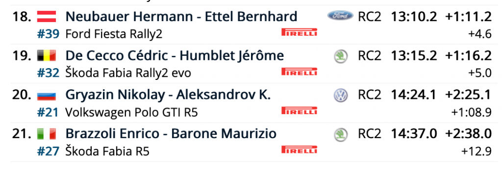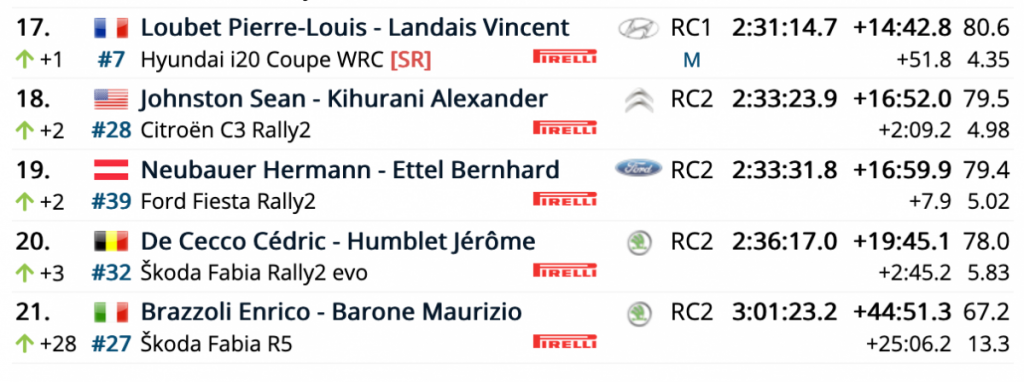 Muy buena últimas especial del sábado para los fineses Kalle Rovanperä y Jonne Halttunen (Toyota Yaris WRC), que logran marcar el tercer mejor tiempo absoluto y ampliar su renta sobre los belgas Thierry Neuville y Martijn Wydaeghe (Hyundai i20 Coupe WRC) en su lucha por el último escalón del podio, logrando sacarles 5.6 en el tramo y ampliar su distancia en la general a 7.0.