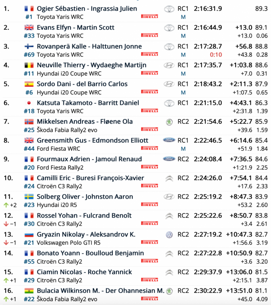 Quintos, en tierra de nadie, siguen los españoles Dani Sordo y Carlos del Barrio (Hyundai i20 Coupe WRC), a 1:07.5 de sus compañeros belgas y a 2:31.8 del japonés Takamoto Katsuta y Daniel Barritt (Toyota Yaris WRC), que están realizando una destaca actuación en un rally siempre muy complicado.