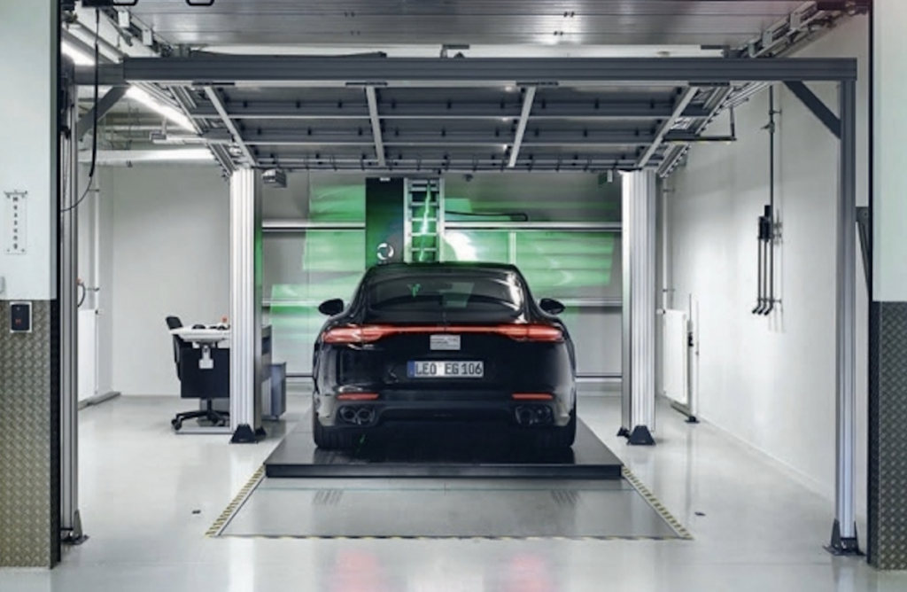 Cada vez hay más vehículos eléctricos en Weissach. La mitad de los 18 bancos de pruebas de la nueva nave que entró en funcionamiento en 2019 sirven para comprobar motores y transmisiones, con mayor o menor electrificación. Una especialidad es el banco de pruebas para sistemas de alto voltaje, en el que se puede comprobar el sistema de propulsión completo, es decir, los motores para los ejes delantero y trasero, la electrónica de potencia asociada, la transmisión y la futura batería de serie de alta tensión. La batería se encuentra en una cápsula de seguridad climatizada debajo del banco de pruebas, y su capacidad se comprueba con unos ciclos de test en todo el espectro de rendimiento.