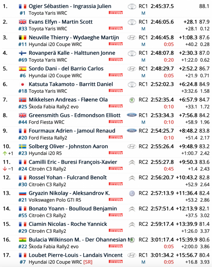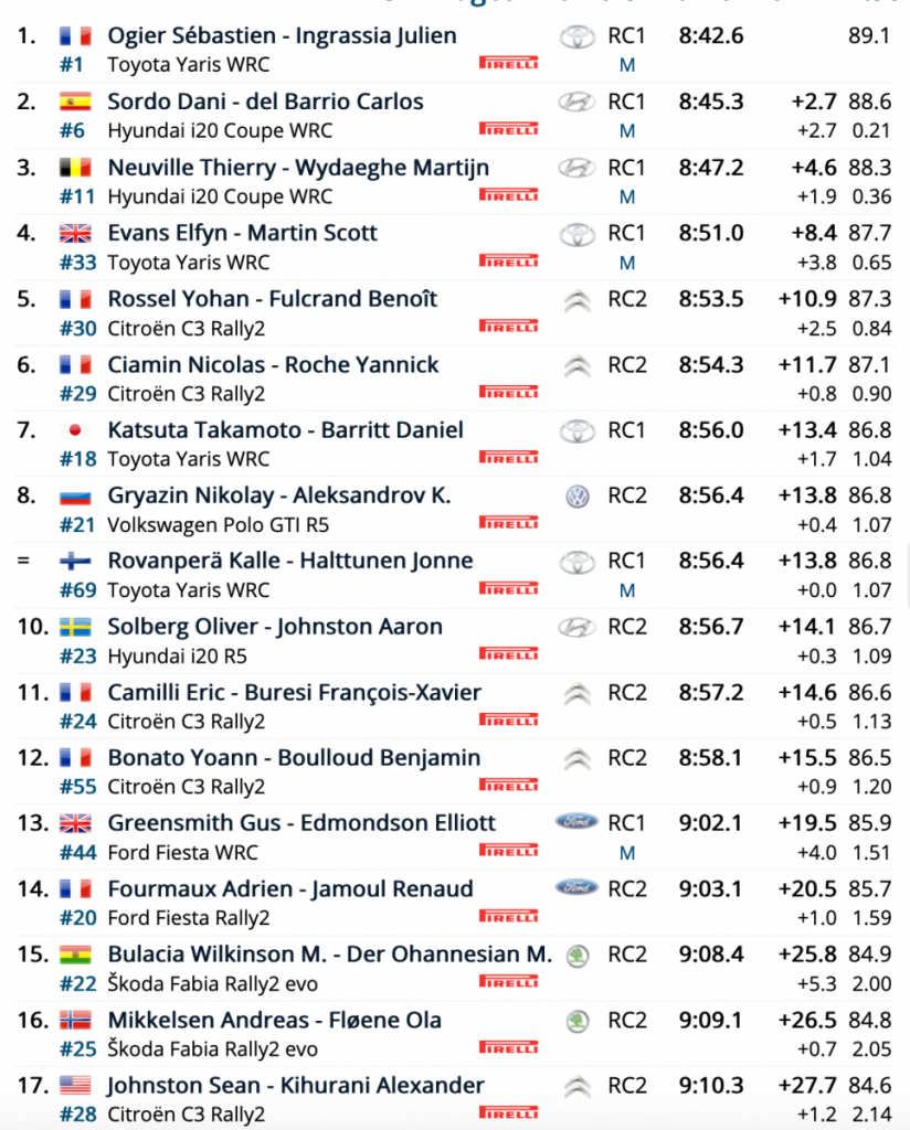La segunda pasada por la especial de Puget-Theniers / La Penne (12,93 km), penúltima del Rally de Montecarlo, ha visto a los galos Sébastien Ogier y Julien Ingrassia (Toyota Yaris WRC) ganar nuevamente. A pesar de su cómodo liderato, ha mejorado su primer tiempo, que era de 8:47.6, por un 8:42.6 en su segunda pasada, superando a los españoles Dani Sordo y Carlos del Barrio (Hyundai i20 Coupe WRC), segundos del tramo y quintos de la general, en 2.7. Terceros del tramo y de la general eran los Thierry Neuville y Martijn Wydaeghe (Hyundai i20 Coupe WRC), a 4.6, mientras que los británicos Elfyn Evans y Scott Martin (Toyota Yaris WRC) marcaban el cuarto mejor crono y se quedan en la general a 28.1 del liderato a falta de la crono de Briançonnet / Entrevaux (14.31 km), que será Power Stage.