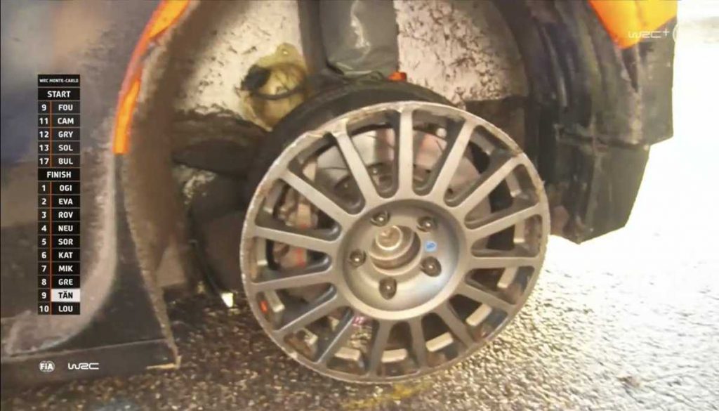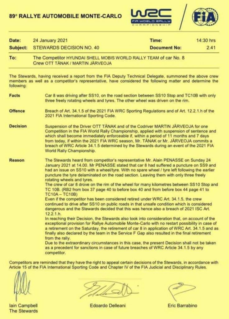 A las 14.20 horas de este domingo, los comisarios del Rally de Montecarlo sancionaron al conductor estonio, culpable de haber conducido hasta al parque de asistencia Gap sobre tres ruedas, lo que representa una infracción a la normativa (artículo 34.1. 5 del reglamento deportivo de la FIA).