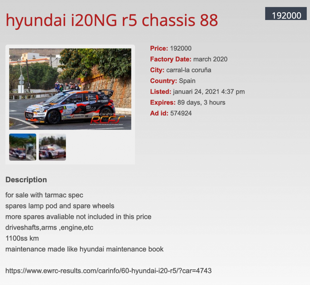 El rápido piloto gallego Iván Ares ha puesto a la venta el Hyundai i20 R5 chasis #88, unidad con la que ha competido en esta pasada temporada 2020 y que tiene un total de ocho carreras a sus espaldas.