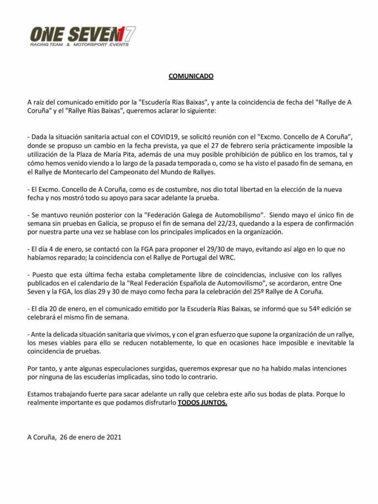 One Seven, entidad organizadora el Rallye de A Coruña, ha informado que la vigésimo quinta edición se disputará el 29 y 30 de mayo