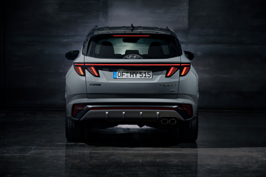 Para enfatizar el aspecto deportivo del vehículo en la parte trasera, el Nuevo TUCSON N Line está equipado con un spoiler aerodinámico más largo que el del modelo estándar y rematado con aletas. La parte inferior de la zaga está acentuada por una banda reflectante roja y un difusor. Por su parte, los agresivos tubos de escape dobles subrayan el hecho de que los diseñadores han tomado muchas referencias del mundo de los coches de alto rendimiento.