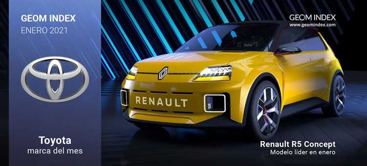 Renault ha comenzado fuerte 2021, con la intención de posicionarse bien en un año en el que la industria automovilística sueña con la recuperación del mercado tras el varapalo del año pasado. Aunque la pandemia parece que seguirá marcando el devenir de los próximos meses, las marcas trabajan para mantener la ilusión (y las ganas de comprar) de los amantes de los coches. En este contexto, la firma francesa ha desvelado el prototipo Renault R5 Concept, que rápidamente se ha convertido en una de las estrellas en la red, situándose como el modelo más valorado por los internautas españoles en enero. Toyota, en el apartado de fabricantes, también firmó un excelente inicio de temporada, con su primer puesto en el GEOM Index de marcas.