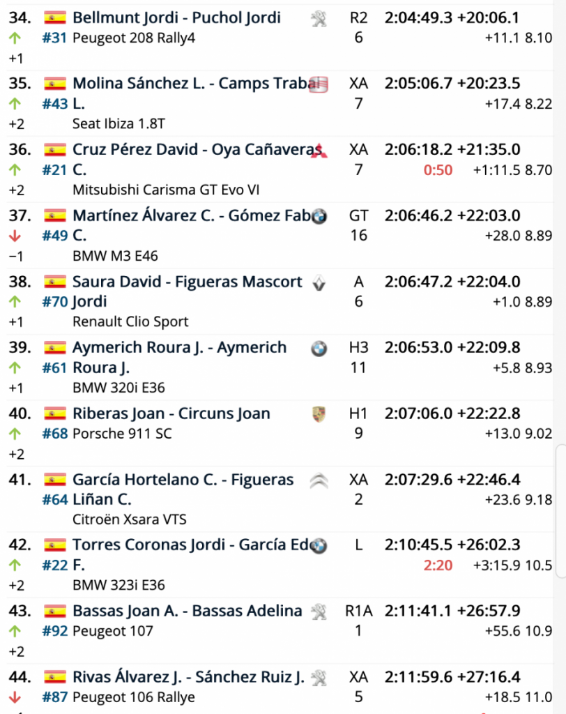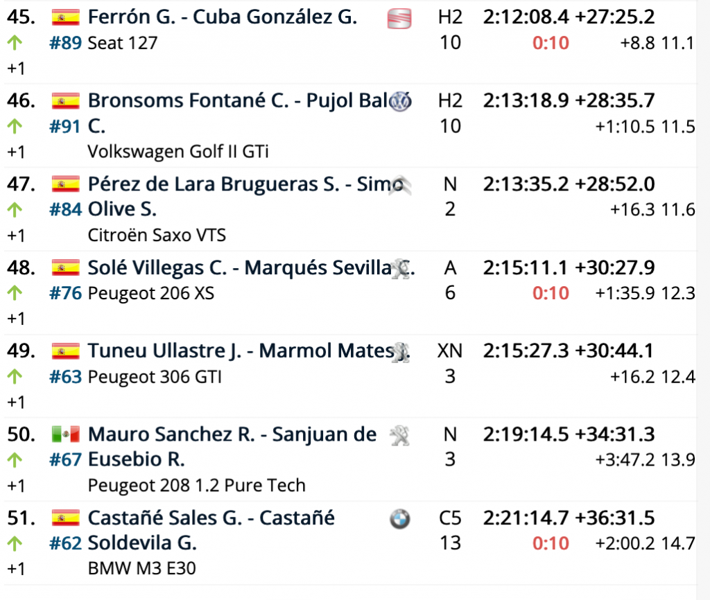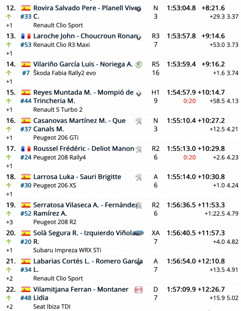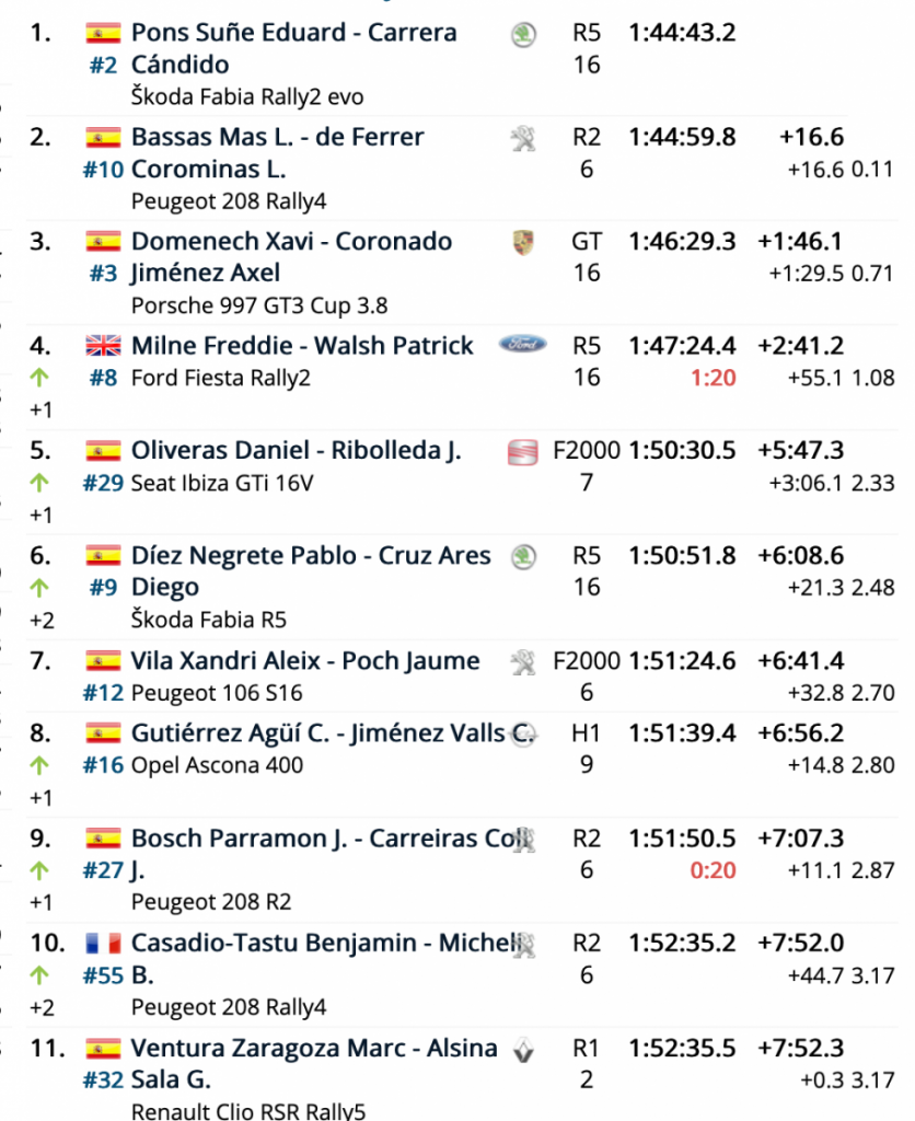 Quintos fueron Daniel Oliveras y J. Ribolleda con su Seat Ibiza GTi 16V, seguido del equipo cántabro formado por Pablo Díez y Diego Cruz en su estreno con su nuevo Skoda Fabia R5.