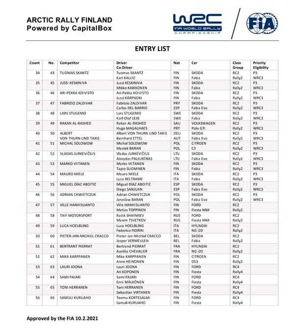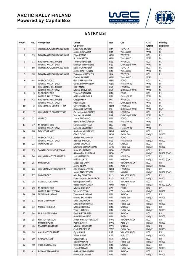 Se ha publicado lista de inscritos del Artic Rally de Finlandia, segunda cita del Campeonato dle Mundo de Rallys 2021.