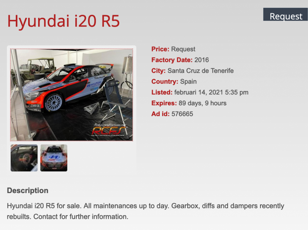Al igual que ha ocurrido con los Hyundai i20 R5 que ha pilotado la pasada temporada el lanzaroteño Yeray Lemes como el grancanario Toñi Ponce, el tinerfeño Ángel Bello también ha puesto la venta su Hyundai i20 R5.
