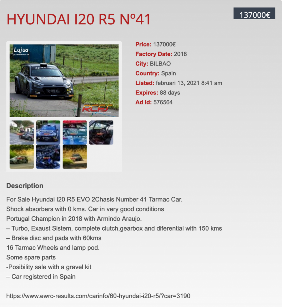 El piloto vasco Xabier Lujúa es otro de los muchos propietarios que ha puesto a la venta su Hyundai i20 R5. En su caso de trata del chasis número 41, la que fue ganadora del Campeonato de Portugal de Rallys en la temporada 2018 en manos de Armindo Araújo y que también pasó por las manos de Dani Sordo, Yeray Lemes o Francisco López.