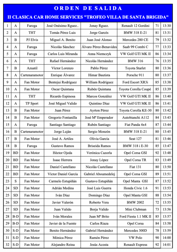 Orden de salida y horarios de paso de la II Clásica Car Home Services Por Rafa León Última actualización: 26/02/2021 20:54 Compartir FacebookTwitterWhatsAppEmailTelegramLinkedin Publicado el orden de salida y horarios de paso de la II Clásica Car Home Services (Gran Canaria). Campeonato de Las PalmasCanariasClásica Car Home ServicesEspañaEuropaGran CanariaLas Palmas Compartir