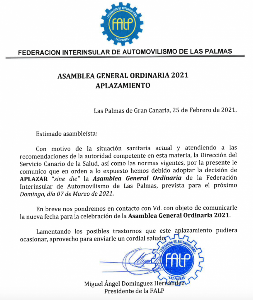 Miguel Ángel Domínguez, presidente de la Federación de Automovilismo de Las Palmas ha informado que la Asamblea General Ordinaria queda aplazada.