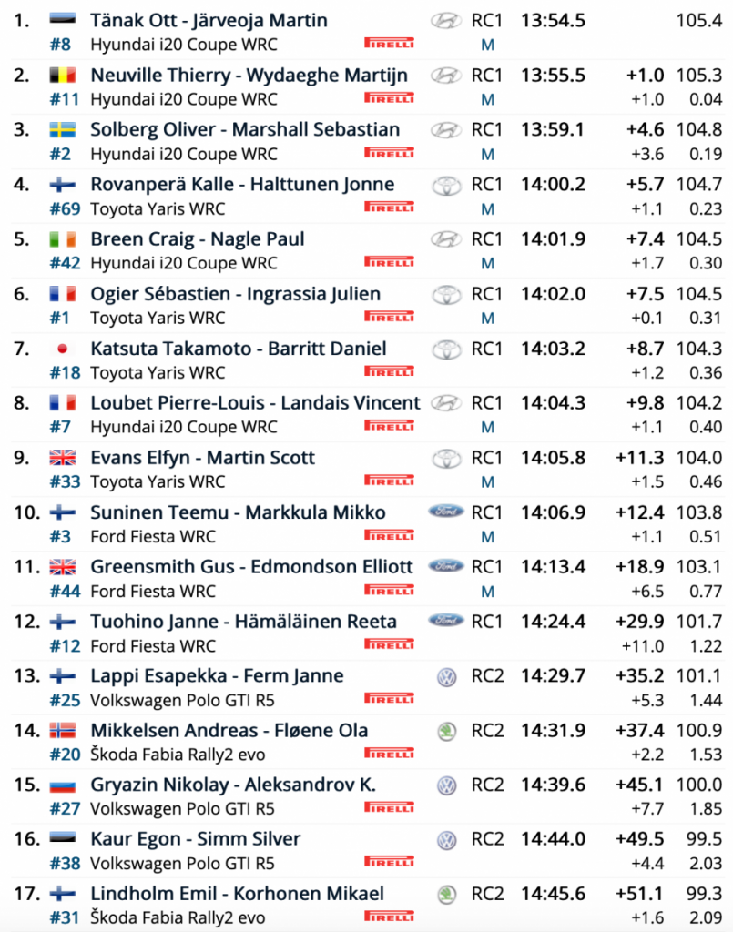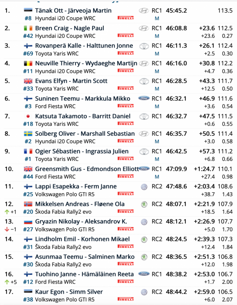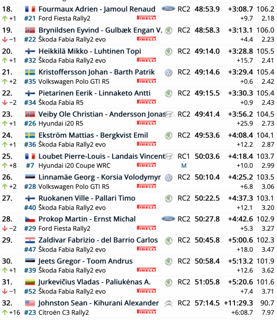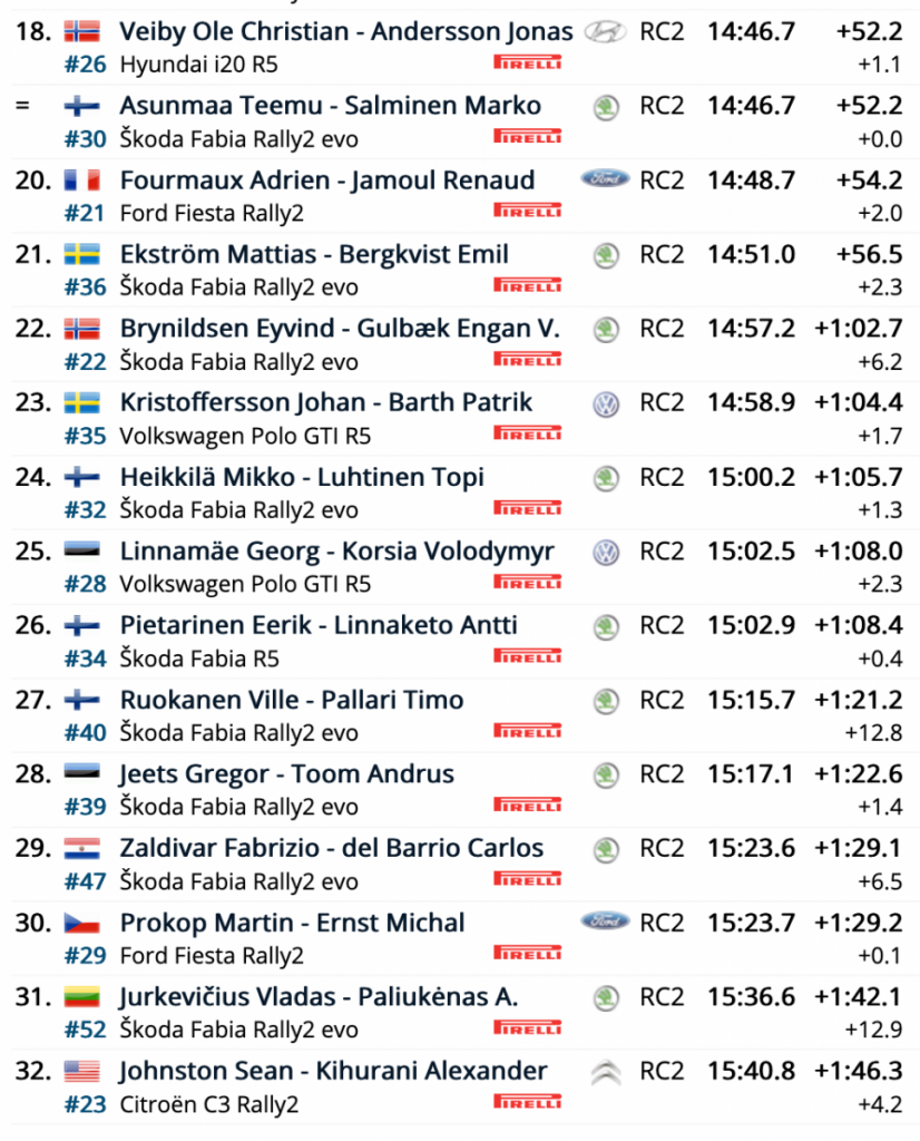 Kalle Rovanperä y Jonne Halttunen (Toyota Yaris WRC) ha marcado el cuarto mejor crono de la especial, mientras que Craig Breen y Paul Nagle (Hyundai i20 Coupe WRC) eran los siguientes en la línea de meta. Breen, segundo en la general, está ahora a 23.6, mientras que Rovanperä continúa tercero a 26.1, pero con Neuville pisándole los talones desde la cuarta posición a solo 4.7, el mismo tiempo que le ha recortado en esta primera crono del sábado.
