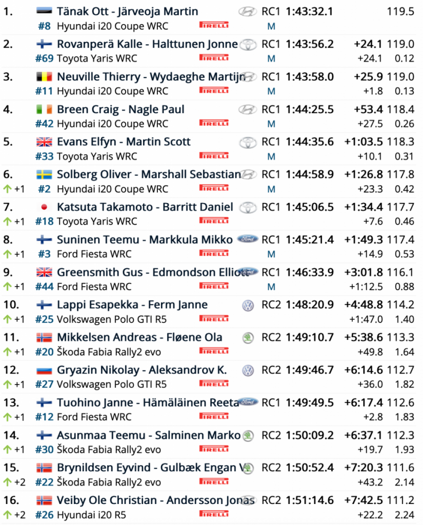 La décima plaza es para los finlandeses Esapekk Lappi y Janne Ferm (Volkswagen Polo GTI R5), primera unidad R5, seguido de los noruegos Andreas Mikkelsen y Ola Fløene (Škoda Fabia Rally2 evo), undécimos.