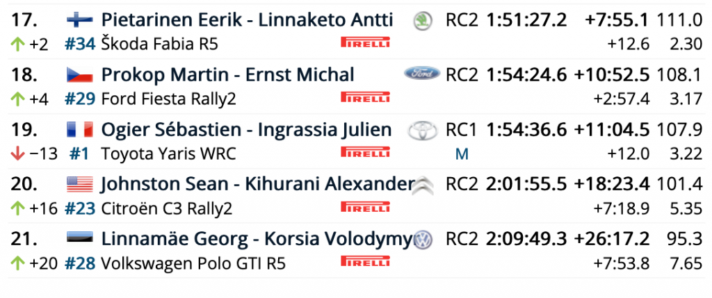 El japonés Takamoto Katsuta y el británico Daniel Barritt (Toyota Yaris WRC) continúan en una gran séptima plaza, siendo octavos el primer equipo de M-Sport compuesto por los fineses Teemu Suninen y Mikko Markkula (Ford Fiesta WRC), que están justo delante de sus compañeros de equipos, los británicos Gus Greensmith y Elliott Edmondson (Ford Fiesta WRC).