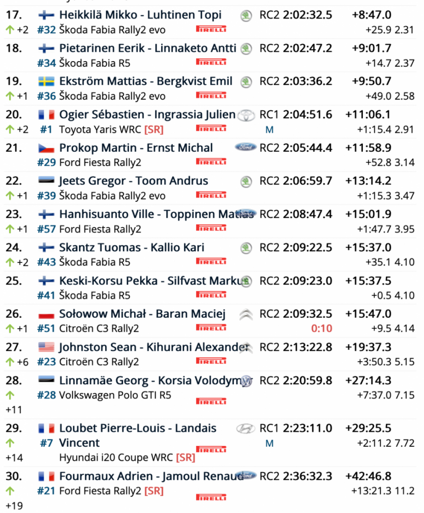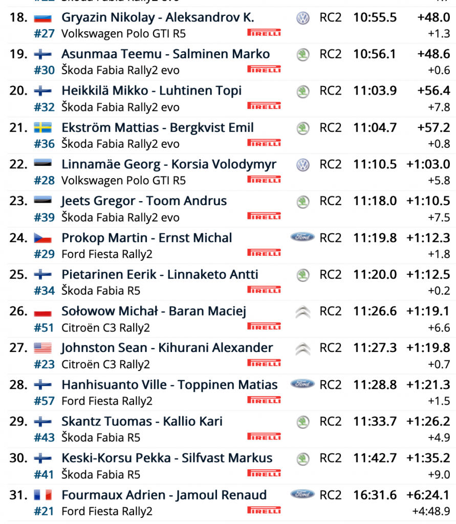 Rovanperä estima que «no tuve un tiempo tan bueno. Ha sido bastante difícil correr este fin de semana. El ritmo no es el que debería ser y estoy luchando en muchos lugares con el coche. Lucharemos hasta el último metro por el segundo lugar».