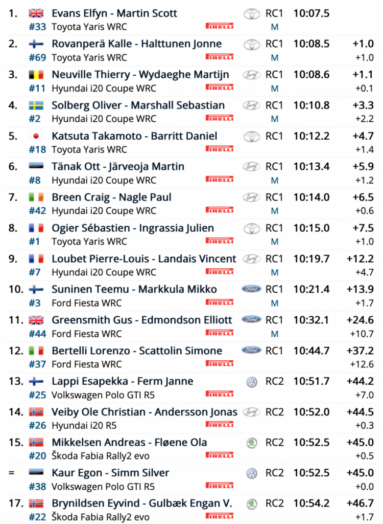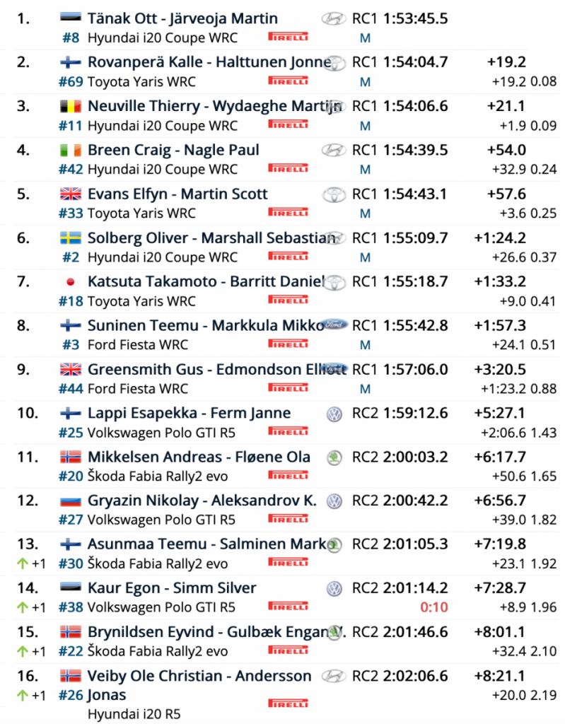 Rovanperä estima que «no tuve un tiempo tan bueno. Ha sido bastante difícil correr este fin de semana. El ritmo no es el que debería ser y estoy luchando en muchos lugares con el coche. Lucharemos hasta el último metro por el segundo lugar».
