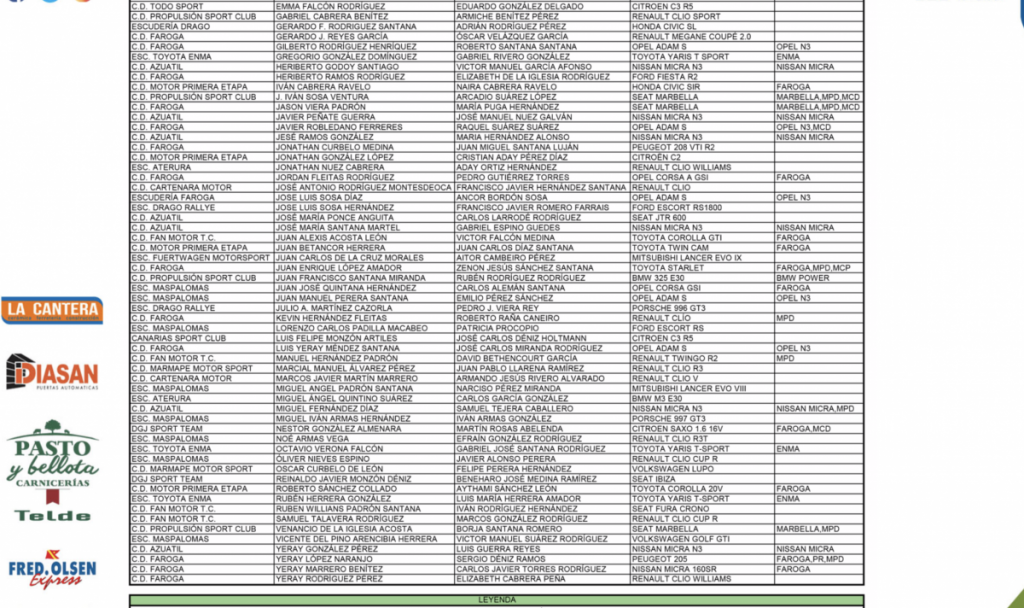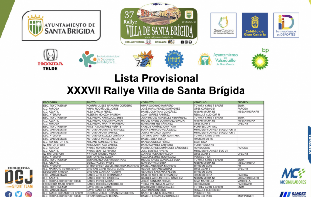 A menos de dos semanas para la celebración del XXXVII Rallye Villa de Santa Brígida, DGJ Sport Team ha hecho pública la relación de equipos inscritos. Un documento que deja entrever la atractiva nómina de participantes que se darán cita el 19 y 20 de marzo en esta prueba que alzará el telón en lo que al Campeonato Bp de Rallyes de Las Palmas se refiere.