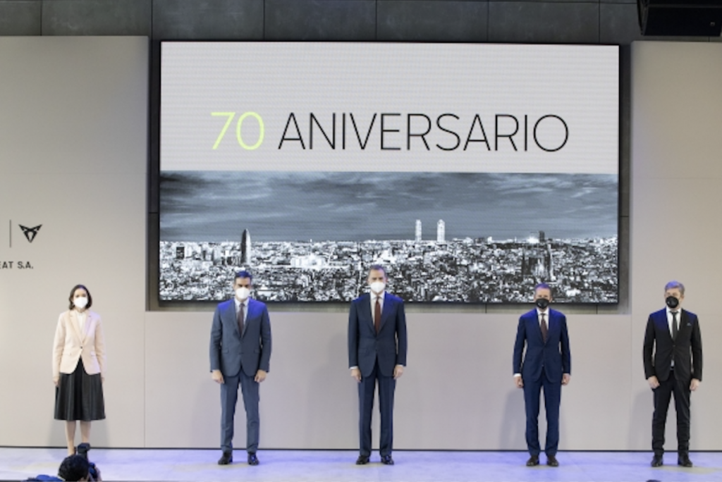 S.M. el Rey Felipe VI y el presidente del Gobierno, Pedro Sánchez, han visitado esta mañana la sede de SEAT S.A. en Martorell para conmemorar el 70 aniversario de la compañía. Ambos estuvieron acompañados por el presidente del Consejo de Administración de SEAT y presidente del Grupo Volkswagen, Dr. Herbert Diess, y el presidente de SEAT S.A., Wayne Griffiths, así como por la ministra de Industria, Reyes Maroto y los miembros del Consejo de Administración de SEAT S.A., Stefan Piëch y Mark Porsche.