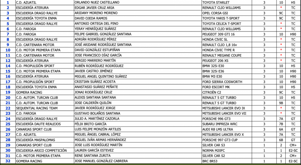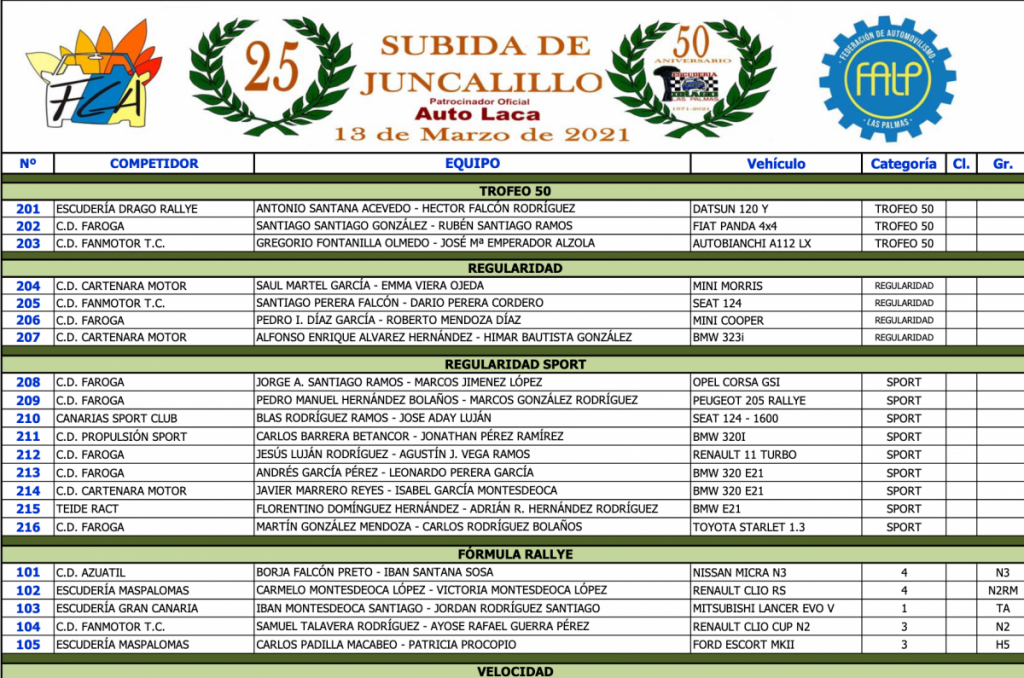 Publicamos la lista Oficial de Inscritos de la 25ª Subida de Juncalillo, primera cita del Campeonato de Canarias y Las Palmas de montaña 2021.