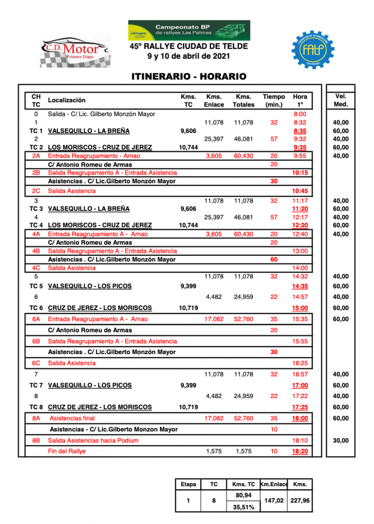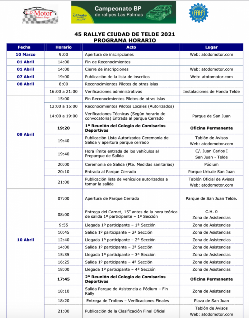 De este modo comienza a cumplirse el programa horario de la prueba teldense, manteniéndose el periodo de inscripción hasta el jueves 1 de abril y ya en la semana grande del 45º Rally Ciudad de Telde, el día 9 de abril se realizarán las Verificaciones administrativas en las instalaciones de Honda Telde y las verificaciones técnicas en el Parque de San Juan, todo ello bajo las medidas de seguridad sanitaria señaladas por las autoridades. Queda pendiente la Ceremonia de Salida por las restricciones sanitarias, que de momento impiden su ejecución.