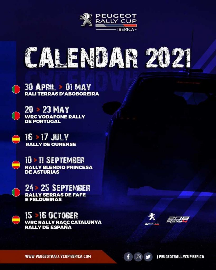 Gestionada a nivel logístico, un año más, por Sports&You, la Peugeot Rally Cup Ibérica 2021 dará comienzo a finales de abril, con el Rali Terras d’Aboboreira, al que seguirá en mayo el Vodafone Rali de Portugal (WRC), y, en julio, el Rally de Ourense. Tras el paréntesis veraniego, la copa regresará a la acción en septiembre para disputar consecutivamente dos pruebas: el Rally Blendio Princesa de Asturias y el Rally Serras de Fafe e Felgueiras. La temporada concluirá en octubre con el RallyRACC Catalunya – Rally de España. Al término de las seis carreras disputadas por los competitivos Peugeot 208 Rally 4, se proclamará a los sucesores de Pedro Antunes / Pedro Alves, los campeones de 2020.