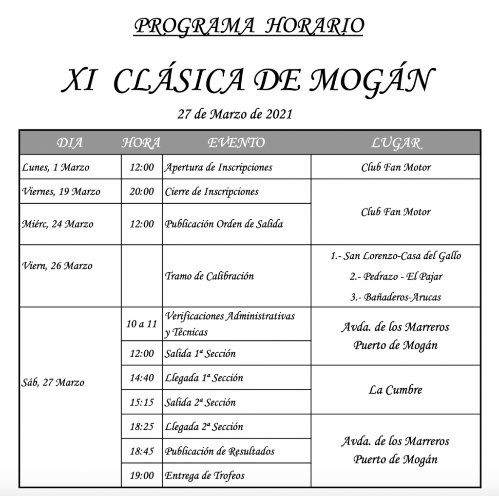 La XI Clásica de Mogán se disputará respetando todas las indicaciones sanitarias impuestas por la pandemia del COVID-19. Como es habitual, se celebrará en una sola jornada el sábado 27 de Marzo, con un recorrido totalmente lineal, bajo la organización de Fan Motor y la colaboración principal del Ayuntamiento de Mogán y el la cadena Cordial, junto a una amplia lista de empresas colaboradoras sin las cuales no sería posible.