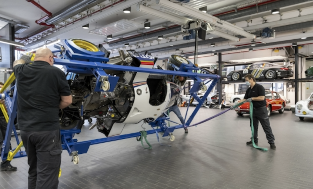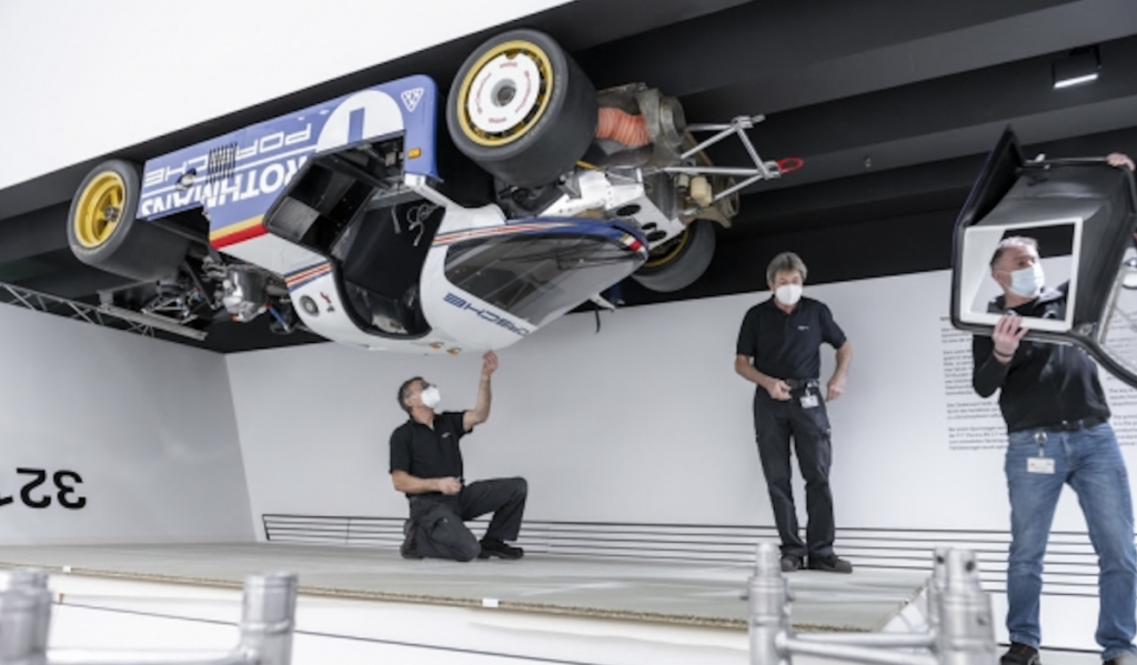 Durante el cierre, el equipo del departamento de Patrimonio y del Museo Porsche tuvo que escalar hasta lo más alto para llevar a cabo un espectacular cambio de exposiciones. El Porsche 956 que anteriormente colgaba del techo de la sala, se envió a los especialistas de coches de competición históricos. Mientras que en el Taller del Museo se reparan y reconstruyen los coches clásicos de producción en serie, en Weissach se lleva a cabo la restauración y el mantenimiento de los coches de carreras históricos. Aquí fue donde el departamento de Patrimonio dejó el coche ganador de Le Mans, con la intención de que fuera transformado para poder circular por carretera. Por el contrario, el Porsche 956 que se utilizó como prototipo de prueba para el legendario motor TAG Turbo de Fórmula 1 y para desarrollar el efecto suelo, ahora está instalado en el lugar del anterior, sobre las cabezas de los visitantes. Los bajos especiales de este vehículo de carreras, que dispone de difusores que generan un efecto de vacío durante la marcha y lo succionan literalmente hacia la carretera, en teoría permitirían también que el 956 se pudiera conducir por el techo.