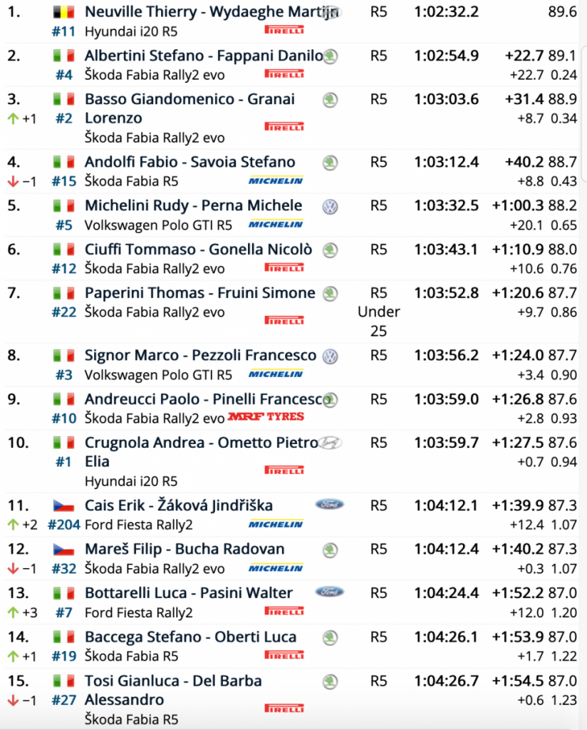 Terceros, con otro Fabia, acabaron Giandomenico Basso y Lorenzo Granai, a 31.4 de la cabeza, a 8.7 del segundo lugar y superando en 8.8 a los cuartos clasificados, Fabio Andolfi Fabio y Stefano Savoia, con otro Fabia, que perdían el último escalón del podio en el tramo final.