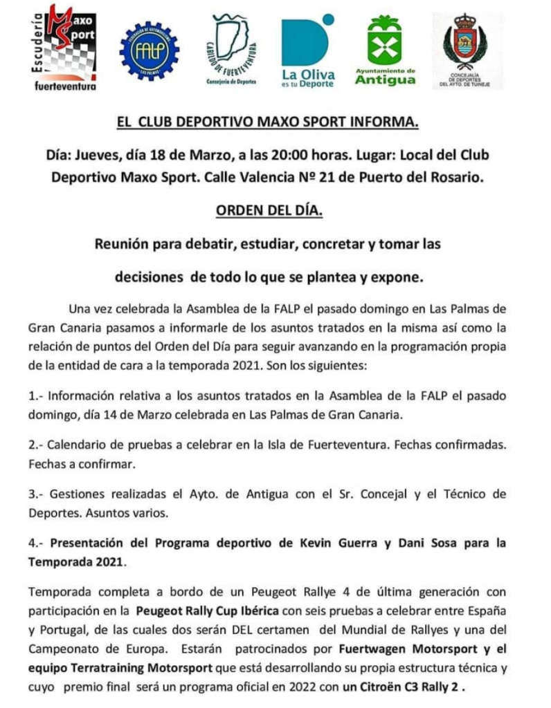 El CD Maxo Sport convoca una reunión para el jueves 18 Por Rafa León Última actualización: 18/03/2021 00:54 Compartir FacebookTwitterWhatsAppEmailTelegramLinkedin El CD Maxo Sport ha convocado una reunión para este jueves, 18 de marzo de 2021. CanariasClub Deportivo Maxo SportEspañaEuropaFuerteventuraLas PalmasMaxo Sport Compartir