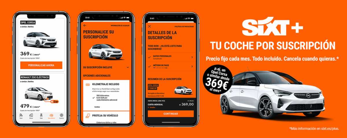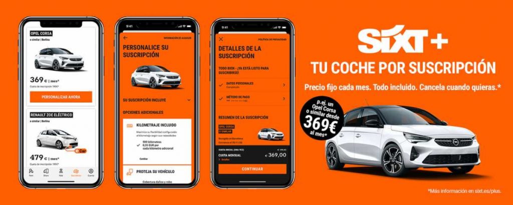 Con SIXT+, el cliente consigue un vehículo que puede utilizar como un coche privado durante el tiempo que desee y cancelable mensualmente después de un periodo mínimo de 30 días; con sólo devolver el coche en la oficina de SIXT, se anula la suscripción. Ésta se puede realizar con tan sólo unos pocos clicks y a través de la App del móvil o de la página web de SIXT; incluye seguro a terceros, cobertura por daños y robo, matriculación, mantenimiento e ITV desde sólo 369 euros al mes y sin permanencia.