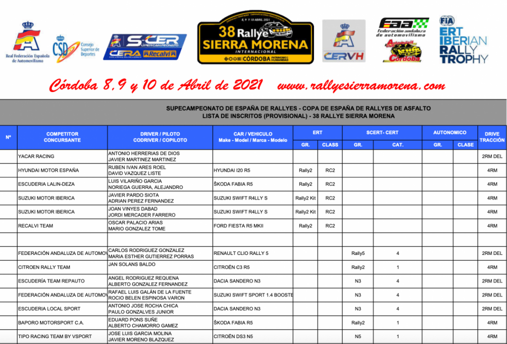 El Rallye de Sierra Morena ( 8, 9 y 10 de abril) abrirá la temporada 2021 en el SuperCampeonato de España de Rallys, y poco a poco se van inscribiendo equipos de los llamados favoritos al título. Es el caso del gallego Iván Ares (Hyundai i20 R5) y el catalán Jan Solans (Citroën C3 R5), que sí estarán presentes en la cita andaluza, quedando a la espera de saber si José Antonio ‘Cohete’ Suárez (Skoda Fabia R5) también se inscribirá.