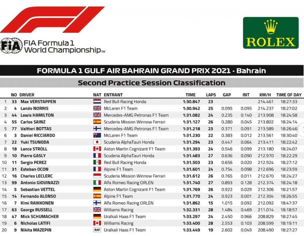 Con las condiciones más similares a las que se esperan en la clasificación y la carrera, en la noche de Sakhir y con menores temperaturas, aunque sin el viento que se espera los próximos días, Verstappen volvió a dominar, esta vez con un tiempo de 1:30.847, 95 milésimas mejor que Norris y 235 sobre el heptacampeón mundial.