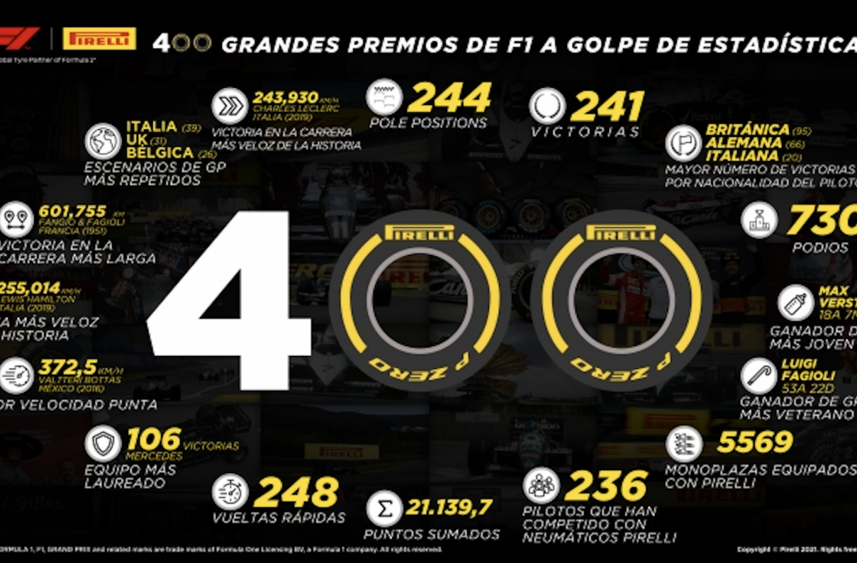 Desde entonces, Pirelli ha acumulado 240 victorias, 243 pole positions, 247 vueltas rápidas y 727 plazas de podio en la Fórmula 1. Baréin acoge, pues, un hito más para una compañía que apuesta firmemente por el deporte del motor desde la victoria en la Pekín-París de 1907, hace más de 110 años. En el transcurso de este año, se han previsto numerosas celebraciones para conmemorar esta efeméride en los canales oficiales en redes sociales de Pirelli, que arrancan con un vídeo y la infografía adjunta a este comunicado, en la que se resumen algunos de los principales hitos estadísticos de estas últimas 400 carreras.
