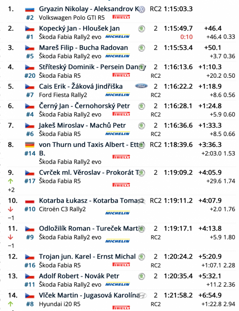 El piloto ruso marcó rápidamente la diferencia al volante de su Polo, logrando superarle al final de la cita en 46.4 sobre el Fabia del piloto local, siendo tercero Filip Mares (Skoda Fabia Rally2) a sólo 3.7 de Kopecky.
