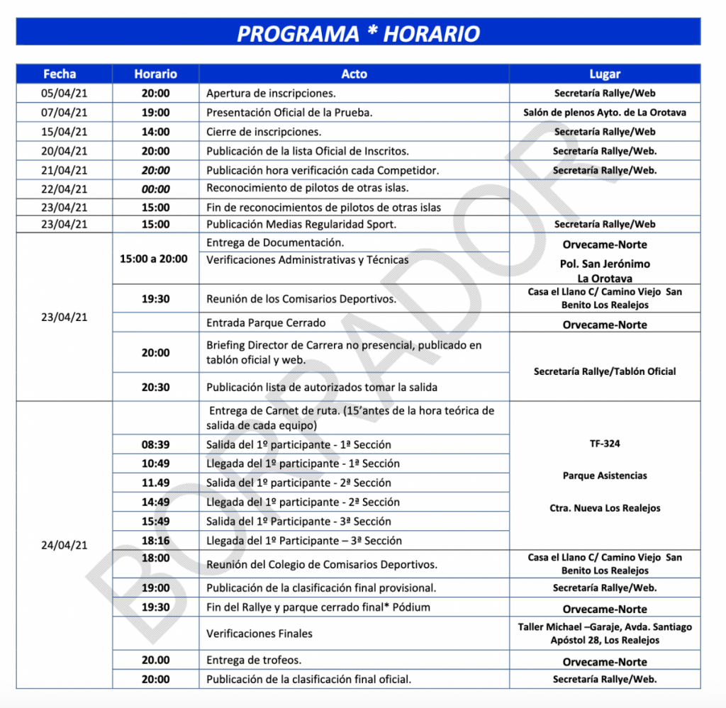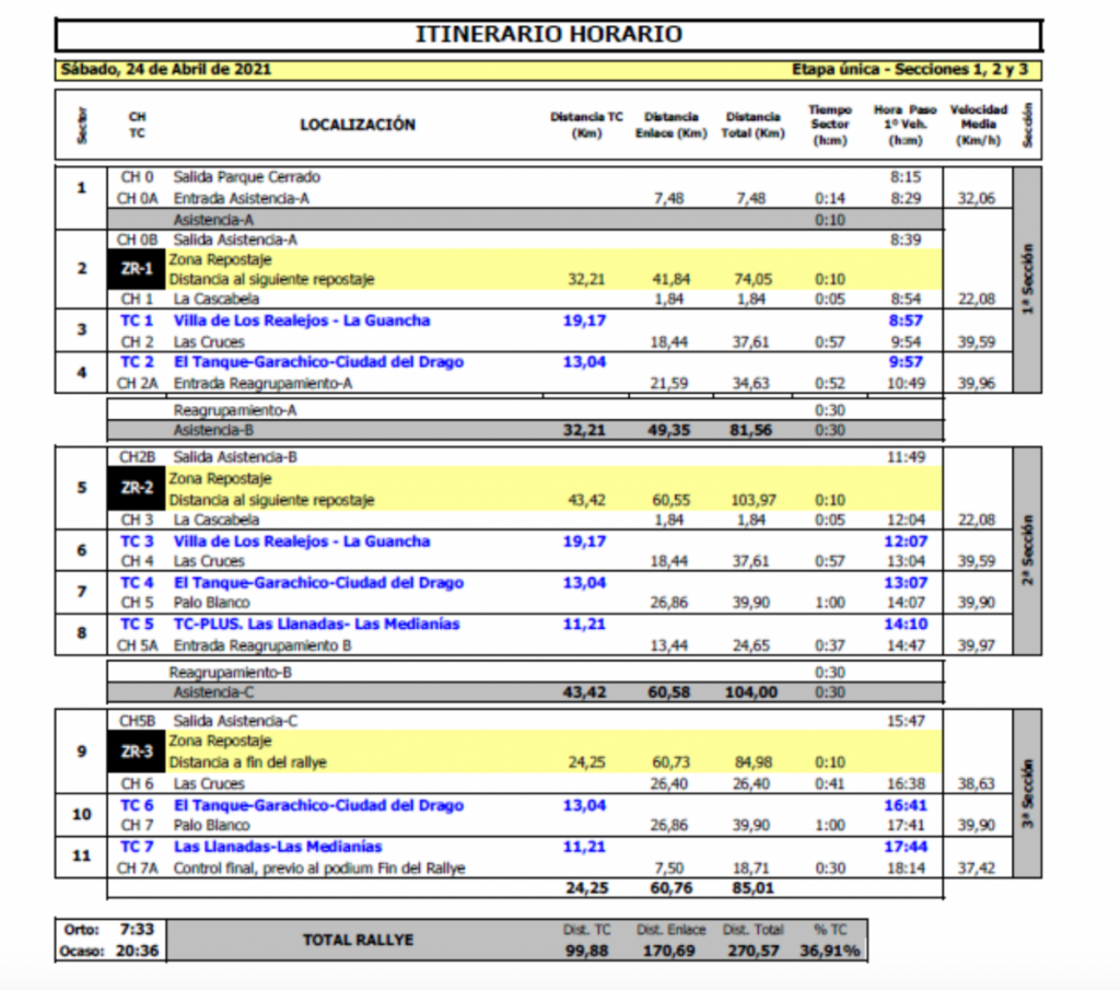 Se arrancará a las 8:57 con el tramo Villa de Los Realejos – La Guancha, siguiendo con la especial El Tanque-Garachico-Ciudad del Drago. Estas dos especiales se repetirán en el segundo bucle, añadiéndosele el tramo Las Llanadas-Las Medianías, que será el TC Plus.