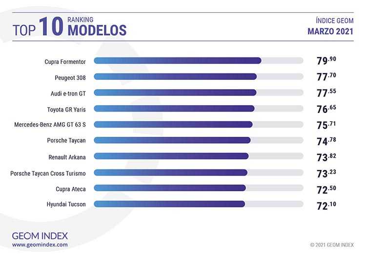 En la lista de modelos, lejos de disipar su buena acogida entre los internautas españoles, el Cupra Formentor continúa siendo uno de los modelos que mejor valoración está cosechando en 2021. Alcanzó los 79.90 puntos, y aventajó con comodidad al Peugeot 308 con 77.70 puntos y el Audi e-tron GT con 77.55 puntos, primer eléctrico del ranking en marzo.