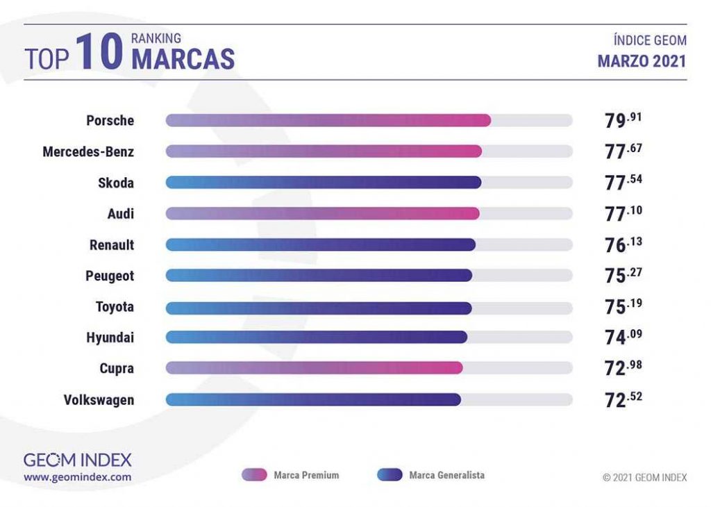 Por segundo mes consecutivo, Porsche no se movió del número 1 del GEOM Index, gracias a las opiniones acumuladas en dos taxonomías principales, las de conducción y diseño . La marca deportiva de Stuttgart alcanzó los 79.91 puntos de valoración. Una de las grandes recuperaciones del mes la protagonizó Mercedes- Benz, que en marzo alcanzó la segunda posición del ranking de la consultora española, segunda también entre las marcas que se engloban en el competido segmento premium con 77.67 puntos de valoración . Skoda ha consolidado en marzo la mejoría del mes anterior, y de nuevo se situó en el podio del GEOM Index, en este caso con 77.54 puntos.