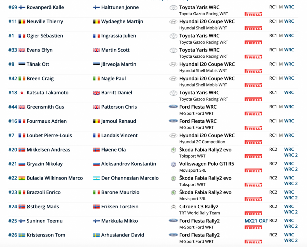 Están los cuatro piloto de Toyota, Kalle Rovanperä, Elfyn Evans, Sébastien Ogier y Takamoto Katsuta, los cuatro de Hyundai Motorsport, Ott Tänak, Thierry Neuville, Craig Breen y Pierre-Louis Loubet y los dos de M-Sport Ford, Gus Greensmith y Adrien Fourmaux, que debutará en un WRC en una cita del Mundial.